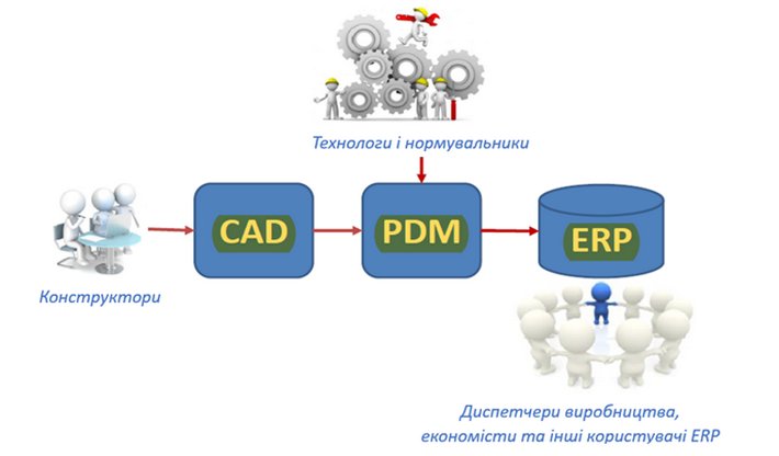 Рис 1. - Ланцюжок процесу «TrinityPDM»: конструктор, технолог, нормувальник, економіст, диспетчер виробництва