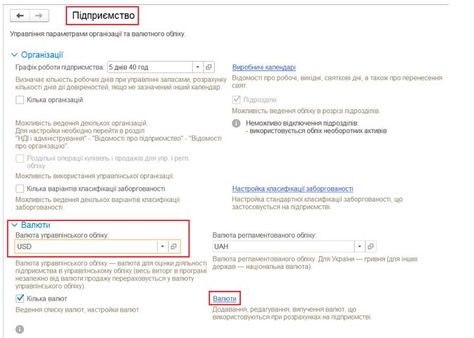 Інформація про валюти управлінського та регламентованого обліку визначається в розділі НДІ і адміністрування – Настройка НДІ і розділів – Підприємство.