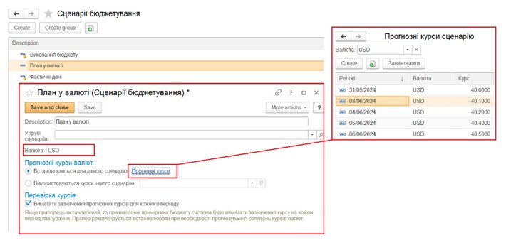 Налаштування: Визначення валют обліку та створення сценаріїв бюджетування з прогнозними курсами.
